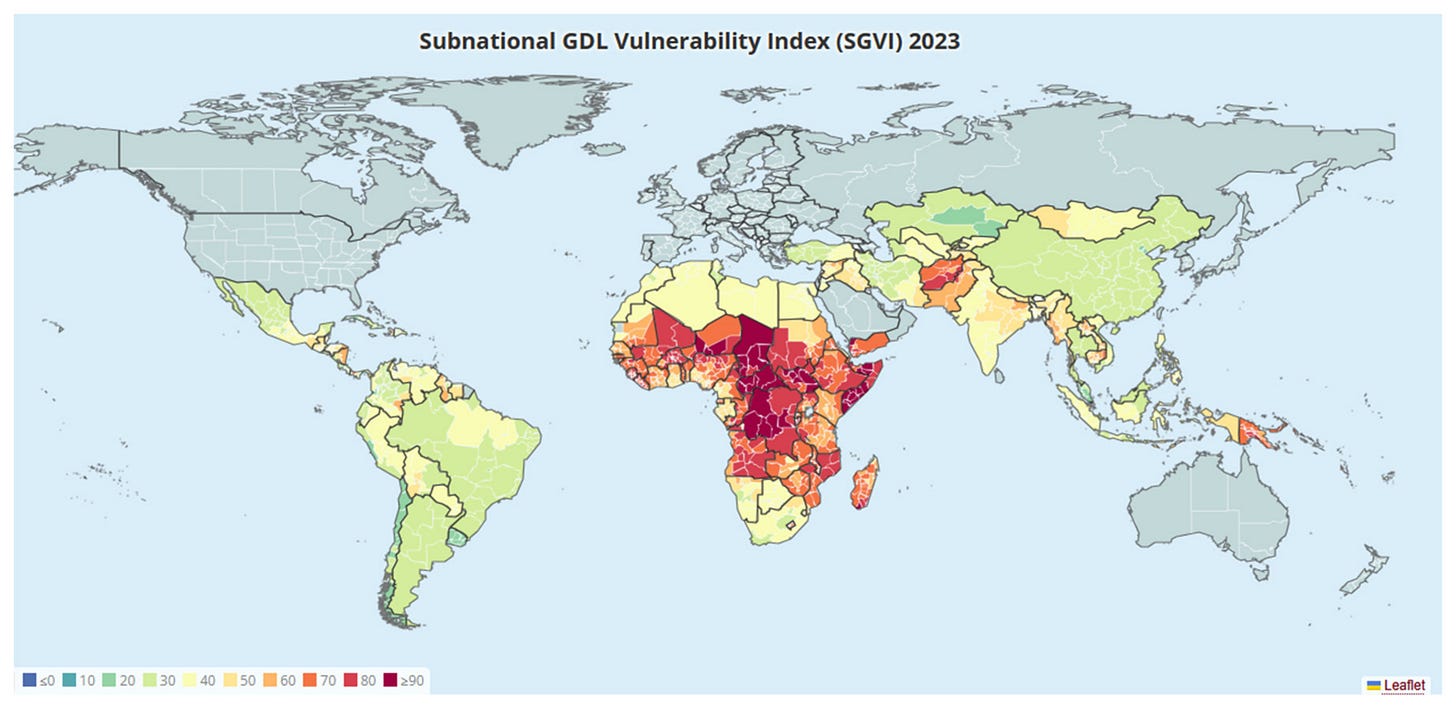 The Subnational Vulnerability Index (SGVI) is a data-driven measure designed to monitor the human dimensions of vulnerability to climate change and natural disasters. It is described in a paper titled “From National Averages to Local Realities: A Subnational Vulnerability Index to Guide Sustainable Development in Low- and Middle-Income Countries” developed by Jeroen Smits and Janine Huisman. Unlike traditional indices that focus only on national averages, the SGVI reveals localized disparities in coping and adaptive capacity which are often obscured by country-level statistics. The data covers 1,260 regions across 118 countries, providing a resolution ten times more detailed than previously available.